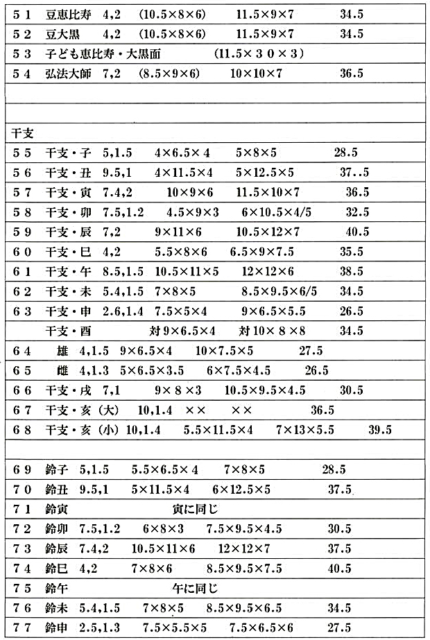 | <55>干支・子 1,100円 <56>干支・丑 1,100円 <57>干支・寅 1,650円 <58>干支・卯 1,100円 <59>干支・辰 1,650円 <60>干支・巳 1,100円 <61>干支・午 1,650円 <62>干支・未 1,100円 <63>干支・申 1,100円 <64>干支・酉(雄) 1,320円 <65>干支・酉(雌) 880円 <66>干支・戌 1,100円 <67>干支亥(大) 1,320円 <68>干支亥(小) 1,100円 |
