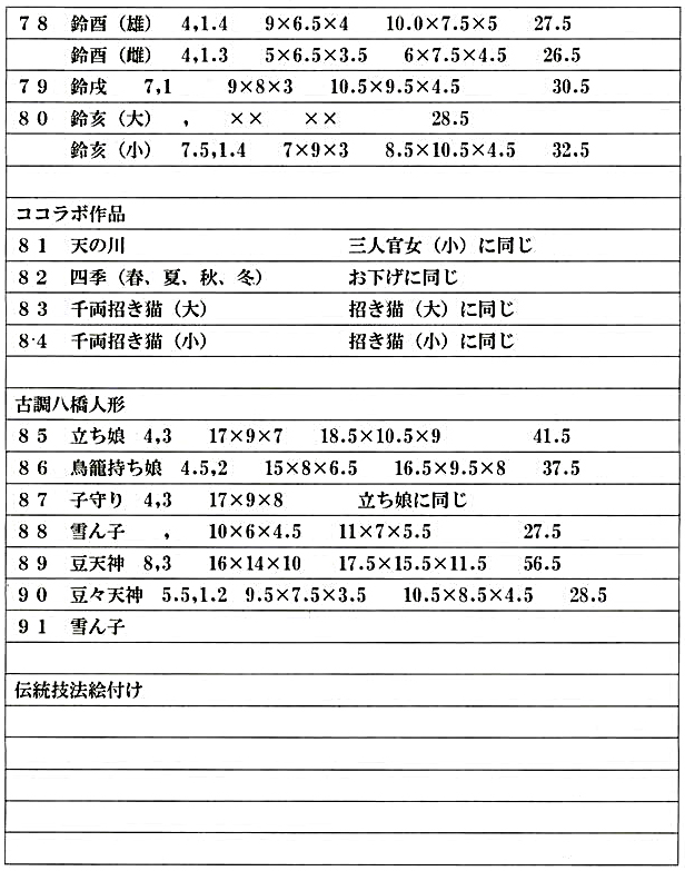 <85>古調・立ち娘 6,600円 <86>古調・鳥龍持ち娘 5,500円 <87>古調・子守り 6,600円 <89>古調・豆天神 5,500円 <90>古調・豆々天神 1,980円 <91>古調・雪ん子 1,650円 |